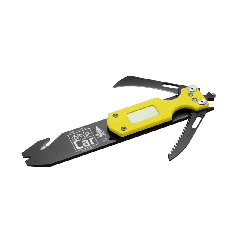· 刀具主體為硬化鋼材,其鑿尖配有除釘器,用於從乘客艙中提起和拆除塑膠面板,露出氣體或火藥裝置(安全氣囊)。附近有安全帶切割器。